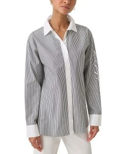 An intriguing fusion of classic and fresh, this striped blouse from Karl Lagerfeld Paris features an easy longer line, a drop hem and a studded logo at the sleeve.
