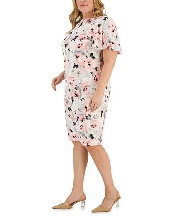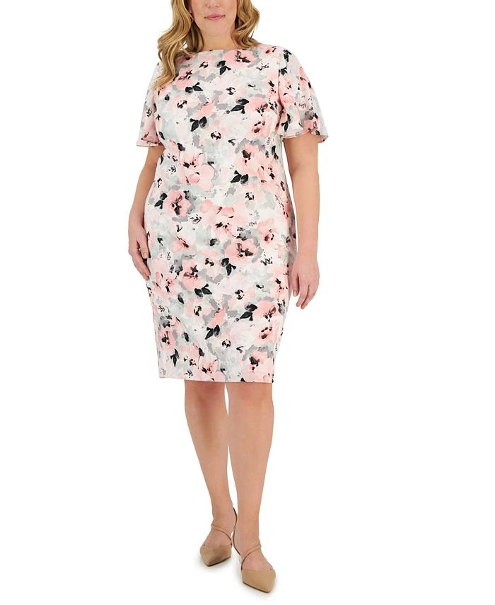 For a work look that’s sleek and chic, Kasper presents this pretty plus size floral-print flutter-sleeve sheath dress.