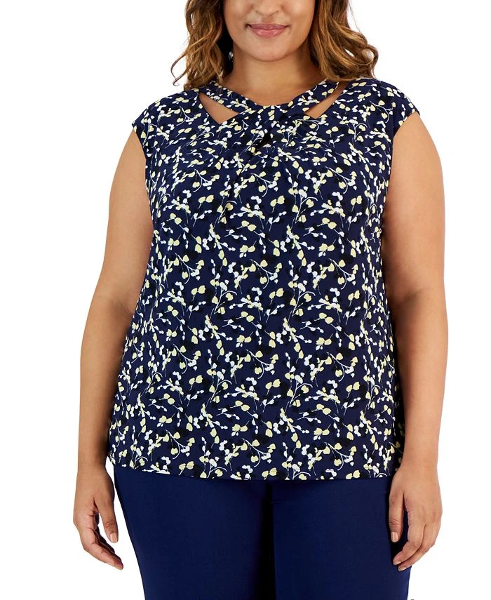 Kasper brings us a plus size blouse that features a sleek twist-neck design and is finished in a charming-but-polished floral print.