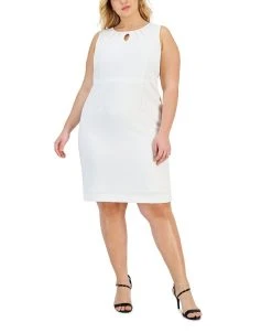 - Pleated round neckline with keyhole detail; Sheath silhouette