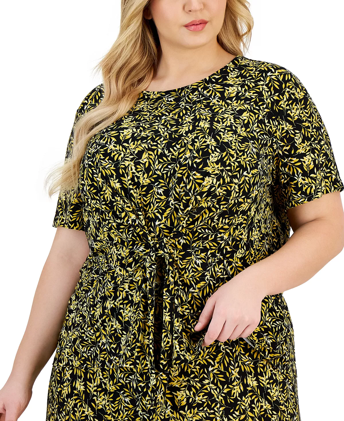 A layering piece with panache, this plus size short-sleeve top from Kasper features ties at the front of the waist and a unique print.