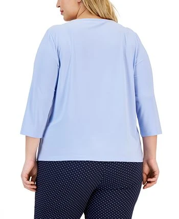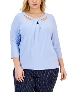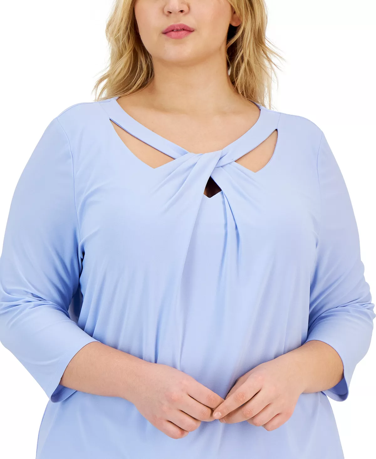 A cooler career essential, this plus size top from Kasper features a twisted crewneck with cutouts and charming 3/4-sleeves.