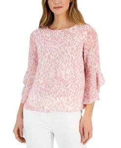 Kasper mixes flowing bell 3/4-sleeves and a delicate allover print in this work-ready blouse.