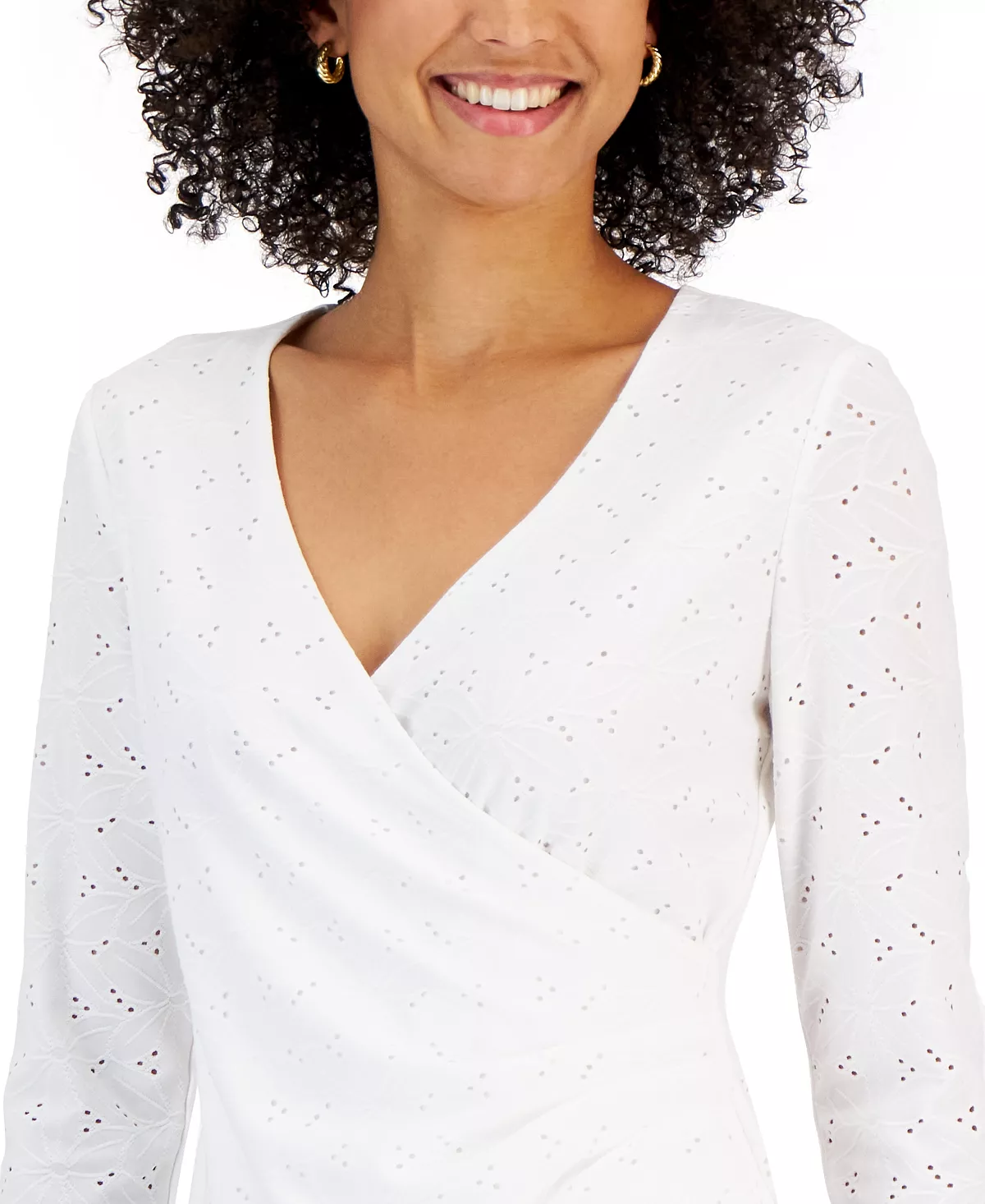 Beautifully embroidered eyelets bring endless style to this faux-wrap top from Kasper, a charming pick finished with 3/4-sleeves.