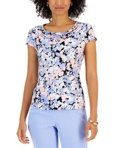 A work-approved pick from Kasper, this short-sleeve top features a beautiful floral print and a cowl neck to match.