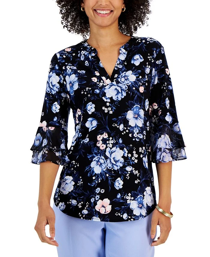 Take your career look in a charming direction with this pretty floral-inspired top from Kasper designed with fluttery cuffs.