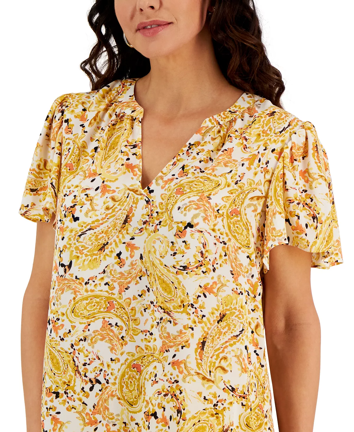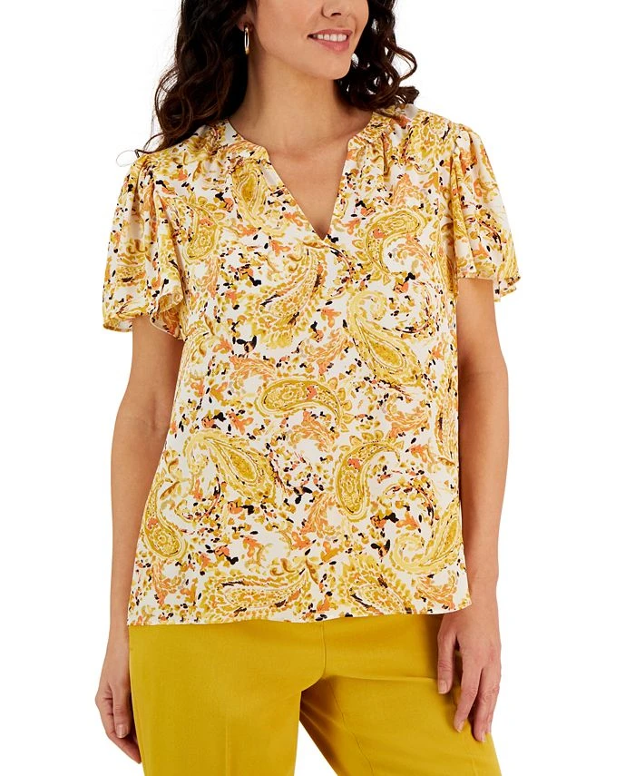 Gently framed with flutter sleeves, this split-neck top from Kasper adds a pop of color in a relaxed fit.