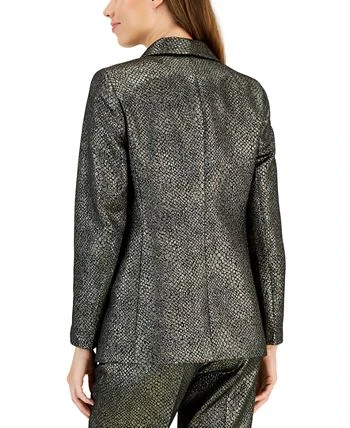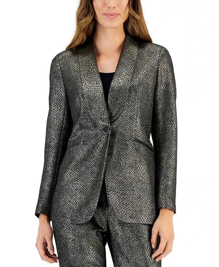 Professional polish in metallic jacquard, Kasper’s shawl-collar one-button jacket makes a stunning statement.