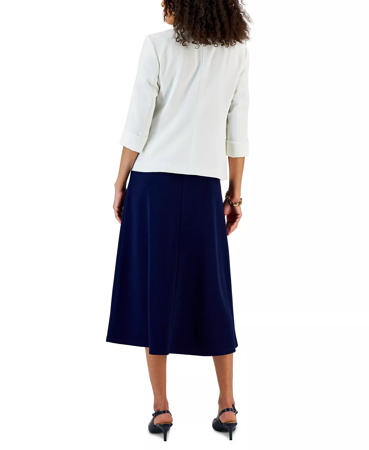 Bring a vibrant look to your work day with this women’s blazer, ruffled top and coordinating A-line skirt from Kasper. Altogether charming, this pairing is guaranteed to shake-up the mid week slump.