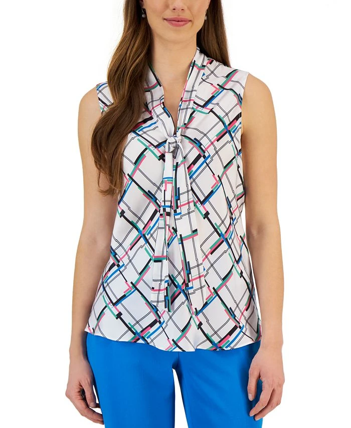 Start your work look off right with this tie-neck sleeveless top from Kasper, covered in an abstract print.