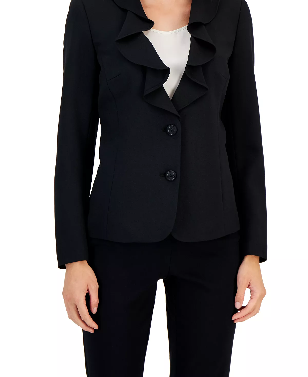 A ruffled neckline brings feminine flair to the professional polish of this two-button jacket from Kasper.