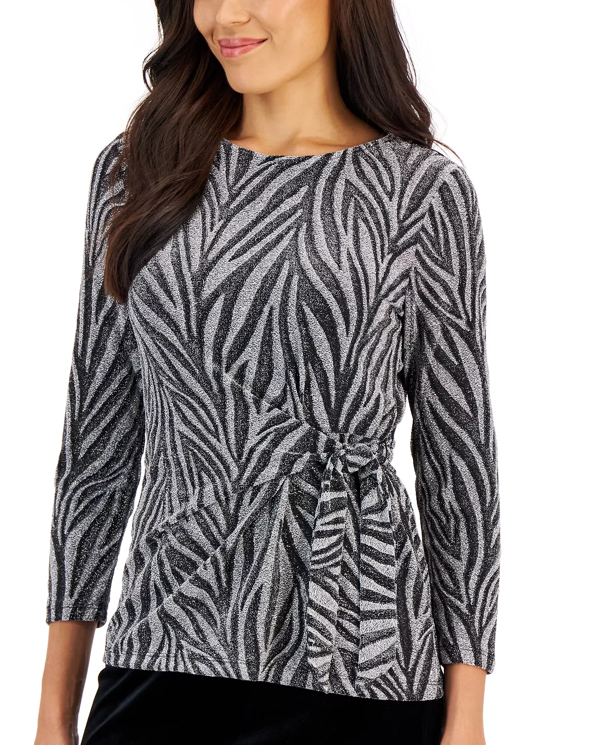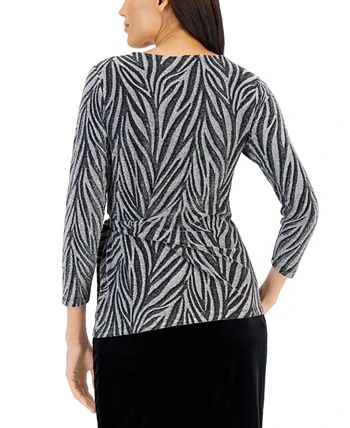 Dress up workdays with the printed metallic dazzle of this Kasper stretch-knit top that stylishly ties at the side.