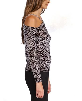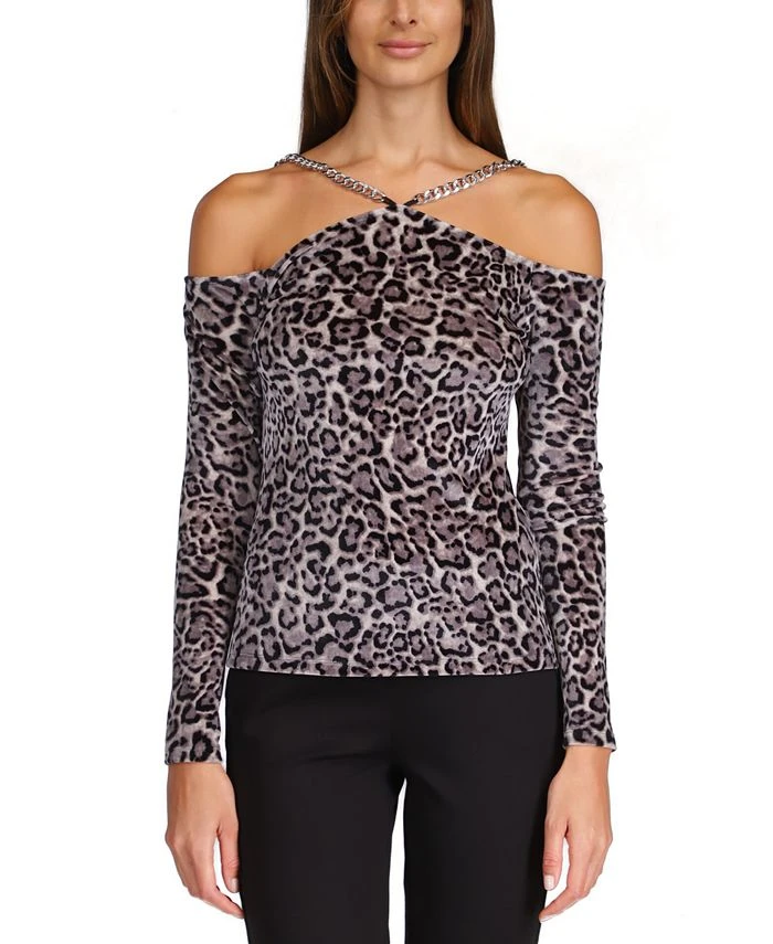 Trendy with an edge. This MICHAEL Michael Kors cold-shoulder top covers plush velvet with a cat print. A chain neckline finishes the fresh look.
