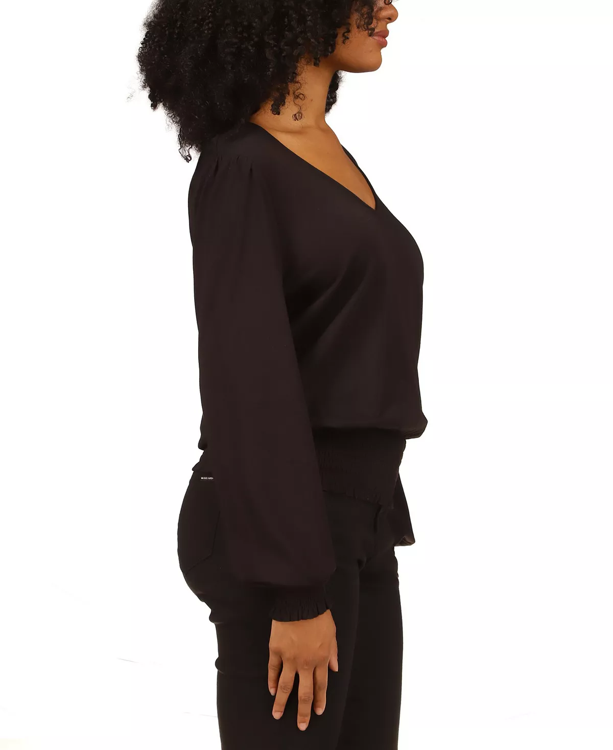 Flowy sleeves and a blousy bodice are cinched with smocking to shape up the jersey-knit style of this V-neck top from MICHAEL Michael Kors.