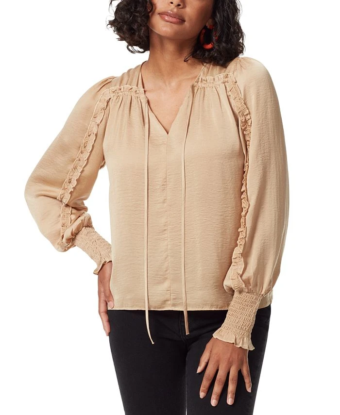 Ruffled sleeves with smocked cuffs beautifully frame this smooth satin blouse from Sam Edelman.