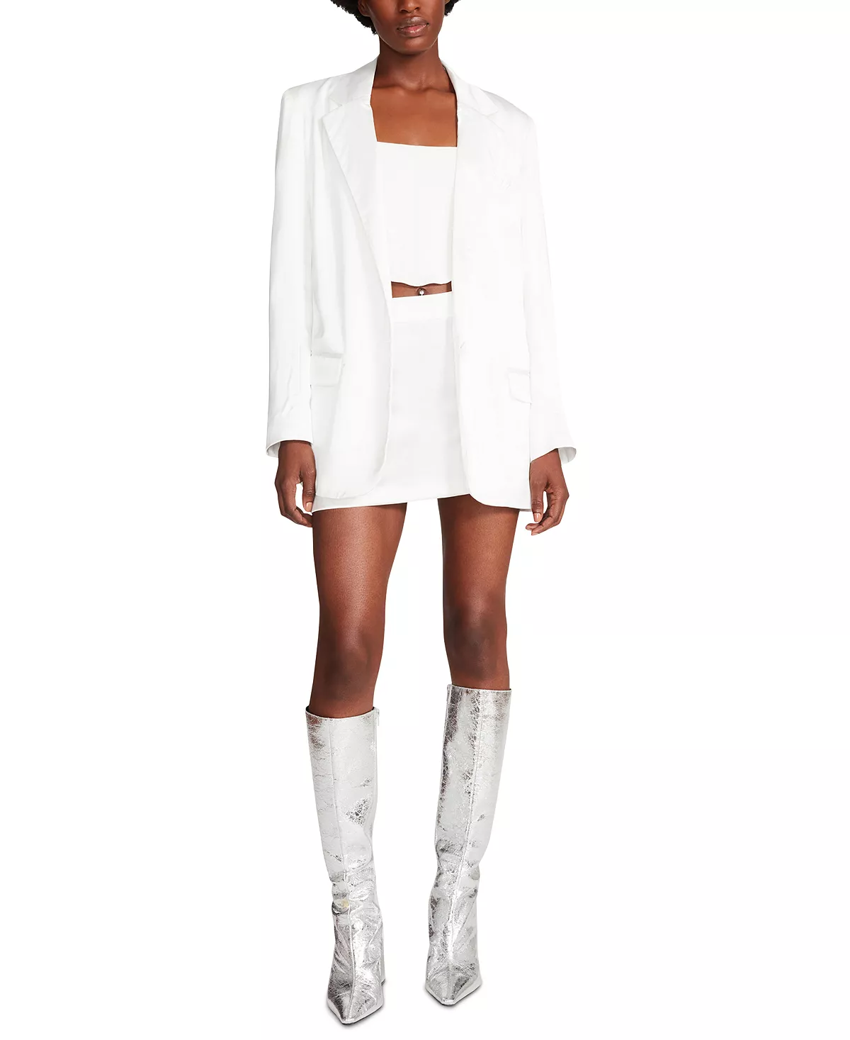Steve Madden’s lustrous satin blazer is designed with an open front for easy on-the-go styling.