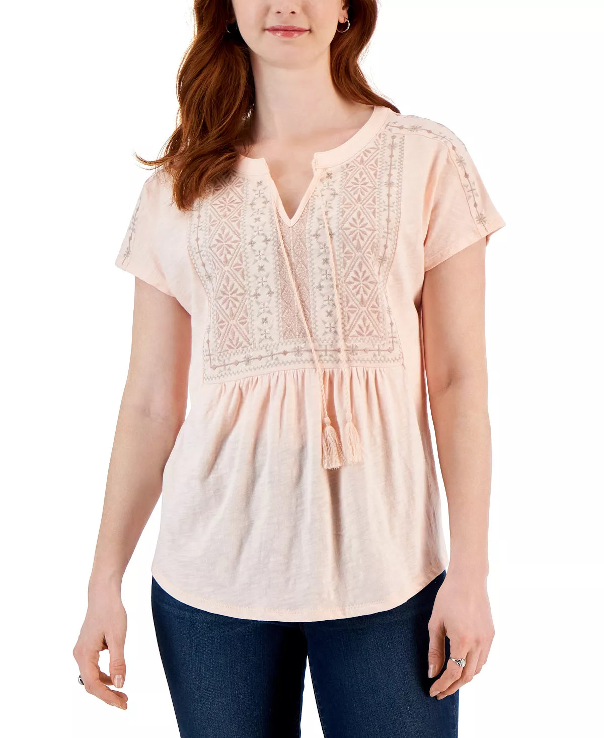 This cotton top by Style & Co is charmingly finished with a sweet, embroidered detail, lending a chic finish to this everyday look.