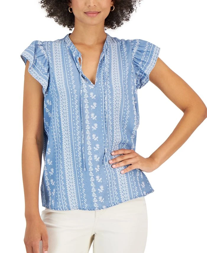Vintage-inspired prints form subtle stripes, bringing this gauzy split-neck top from Style & Co to a charming finish.