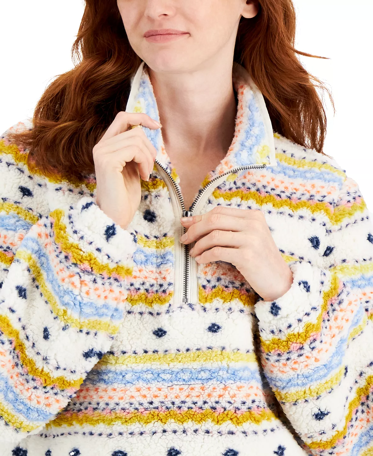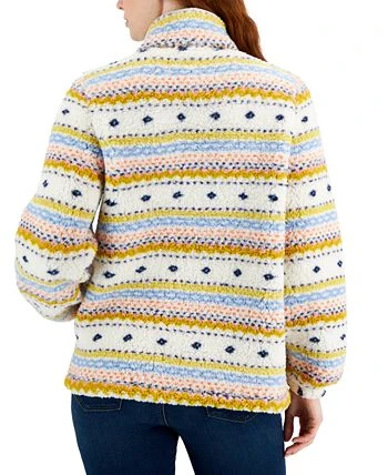 Snowflakes lend endless charm to this cozy sherpa fleece sweater from Style & Co, complete with a mock turtleneck that zips at the front.