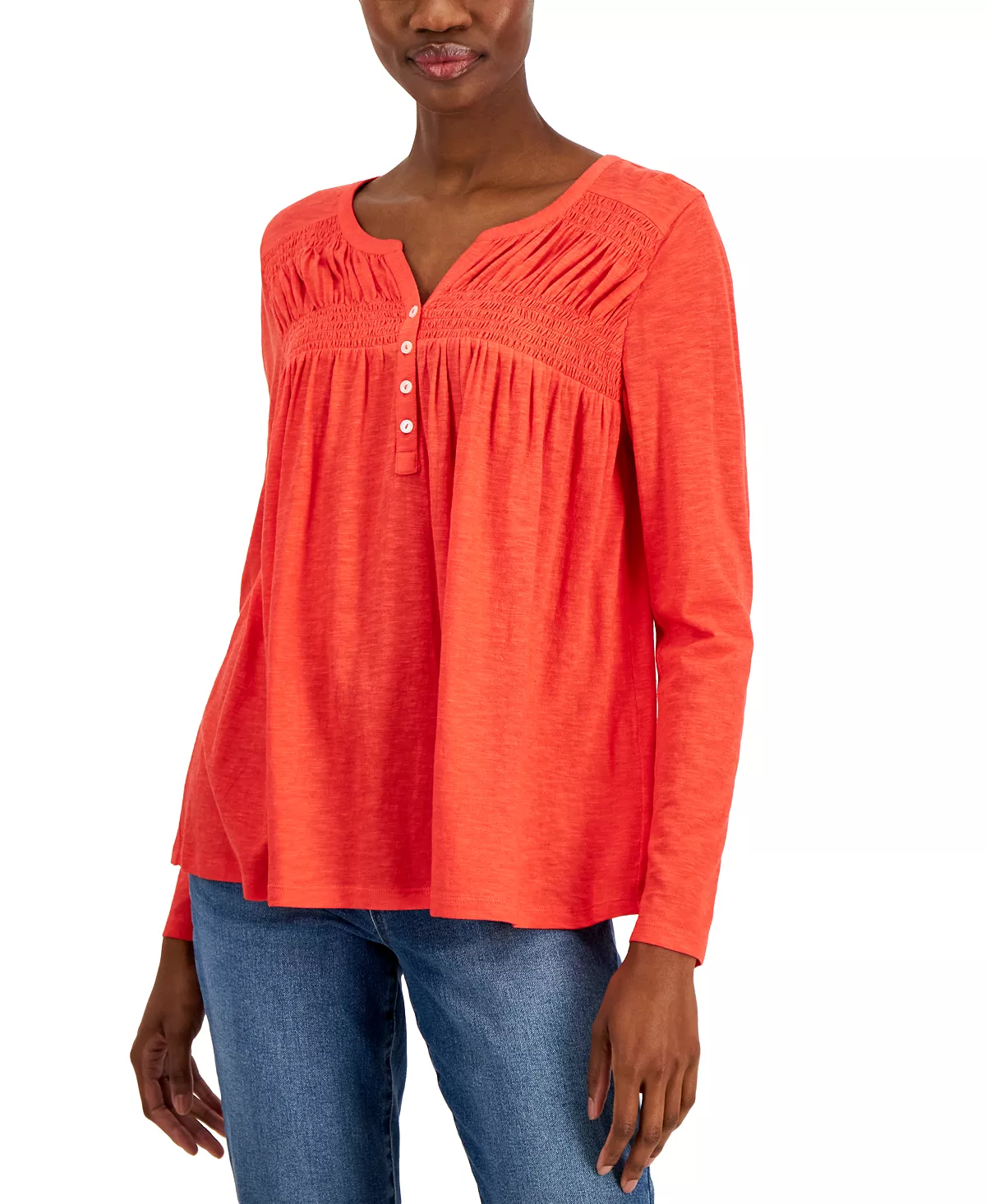 Delightfully delicate, this smocked-yoke top from Style & Co adds a hint of sophisticated style to your wardrobe.