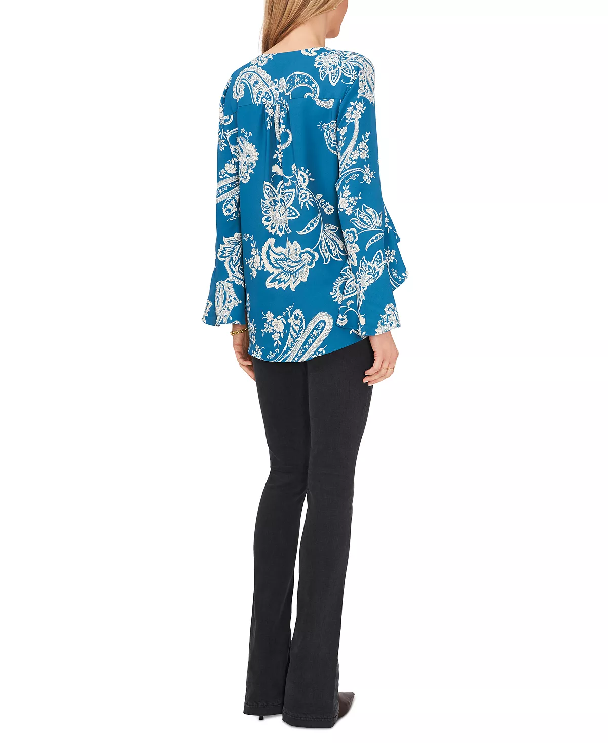 The flutter sleeve V-neck staple from Vince Camuto that is elevated with a trendy print to add to your blouse rotation.