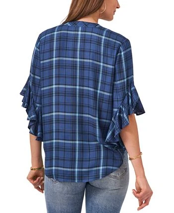 Flowing ruffles deliver a chic twist on classic plaid with this henley-style top from Vince Camuto.